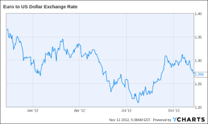 Kesällä alkanut euron valuuttakurssin vahvistuminen suhteessa USA:n dollariin on kääntynyt taas laskuun viimeisen kuukauden aikana. Euro saattaa vielä laskea lisää euroalueen velkakriisin kärjiestyessä jälleen ja alueen taloustilanteen edelleen pahentuessa.