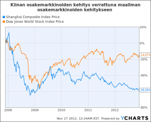 Alla oleva kuvaaja osoittaa, että Kiinan osakemarkkinoiden kehitys on jäänyt yleisestä maailman osakemarkkinoiden kehityksestä. Erkaantuminen alkoi vuonna 2009 ja erot ovat edelleen kasvussa.