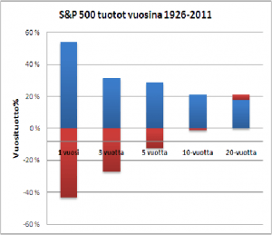 Taulukon mukaan yhden vuoden sijoitusten tuottohajonta oli suuri. Tuotot olivat suurimmillaan lähes 55 prosenttia ja alhaisimmillaan yli 43 prosenttia. Kun tuottoja tarkasteltiin pitemmillä pitoajoilla, tuottojen hajonta laski selvästi. 20-vuoden sijoitusajalla negatiivisia tuottoja ei ollut enää yhdelläkään 20-vuoden jaksolla.