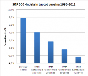 Taulukon mukaan S&P 500–indeksin keskimääräinen vuosituotto vuosina 1996-2011 on ollut 7,8 prosenttia. Jos tuotoista vähennetään 10 eniten tuottanutta päivää, laskee keskimääräinen tuotto 4,1 prosenttiin, eli lähes puolet tuotoista häviää. Jos tuotoista poistetaan 40 eniten tuottanutta päivää, jää sijoitussalkku jo pakkaselle yli 2 prosenttia.