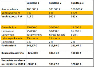 Vertailu tuo esiin suuria eroja erilaisten sijoitustyylien välillä ja paljastaa myös sen, että itse asiassa juuri lainan lyhentämisellä on suurin merkitys sijoittajan kassavirralle. Sijoittaja 3 on kassavirran kannalta ylivoimainen voittaja, sillä hänen vuokratuottonsa on korkea, eikä hän lyhennä lainaa laisinkaan. Sijoittaja 3 myös saa ylivoimaisesti parhaan euromääräisen kassavirran jokaista sijoittamaansa 1000 euroa kohti. On kuitenkin huomattava, että kyse on nimenomaan kassavirran optimoinnista, eikä laskelmassa oteta huomioon muita tekijöitä, kuten asunnon mahdollista arvonnousua.
