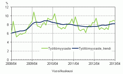 Tilastokeskuksen työvoimatutkimuksen mukaan työttömiä oli vuoden 2013 huhtikuussa 239 000, mikä oli 13 000 enemmän kuin vuosi sitten. Työttömyysaste oli 8,8 prosenttia, kun se edellisvuoden huhtikuussa oli 8,4 prosenttia. Työttömyysateen kausitasoitettu trendi on osoittanut työttömyysasteen nousua jo yli vuoden ajan.