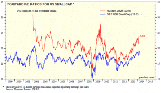Yardenin mukaan ”kupla on tällä kertaa pienissä osakkeissa”. Sijoitusstrategi kertoo blogissaan, että S&P-osakeindeksien pienten ja keskisuurten yritysten ennustetuilla osakekohtaisilla tuloksilla lasketut p/e-arvostuskertoimet ovat 17 ja 19 vastaavasti.
