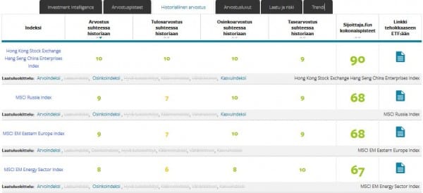 Kärkinelikosta kolmessa indeksissä näkyy Venäjän ja Ukrainan kriisi, joka on laskenut venäläisyhtiöiden osakekursseja ja siten parantanut arvostuslukuja. Myös listan kolmantena olevassa Kehittyvien markkinoiden energiayhtiöt -indeksissä Venäjän paino on 26 %. Jos Venäjä-kriisi pelottaa, niin kärjessä oleva kiinalaisiin yhtiöihiin sijoittava ETF on paras valinta.