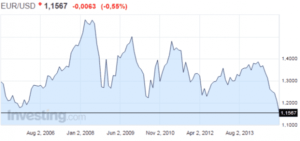 Euron vaihtokurssi suhteessa dollariin on laskenut hurjasti viime vuoden huhtikuusta lähtien. Huhtikuun alussa eurolla sai lähes 1,4 dollaria. Nyt kurssi on romahtanut alle 1,16 dollarin.