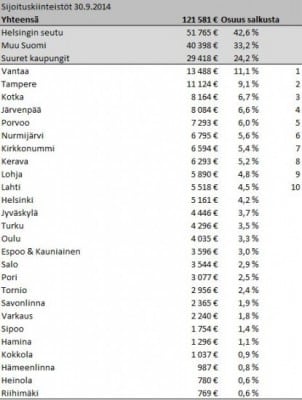 +/- Paremmin asuntomarkkinoita ymmärtävä voi alla olevasta taulukosta arvioida, onko Oravan asuntoportfolio optimaalinen. Oma näppituntuma on se, että kyseisellä portfoliolla voi päästä kohtuulliseen vuokratuottoon, mutta asuntojen realisointi on vaikeampaa. Helsingin seudun osuus portfoliosta on 43 %, mutta Helsingin osuus vain 4,2 %. Suurimmat asuntosijoitukset ovat Vantaalla, Tampereella, Kotkassa, Järvenpäässä ja Porvoossa.