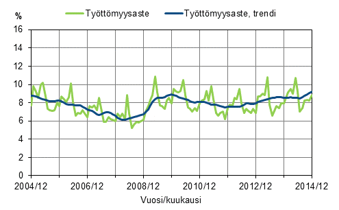 Tilastokeskuksen työvoimatutkimuksen mukaan työttömiä oli vuoden 2014 joulukuussa 232 000, mikä oli 27 000 enemmän kuin vuosi sitten. Työttömyysaste oli 8,8 prosenttia, kun se edellisvuoden joulukuussa oli 7,9 prosenttia.