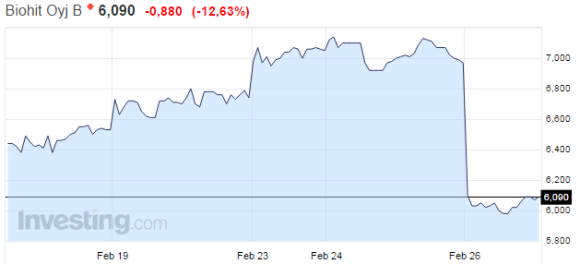 Bioteknologiayhtiö Biohitin osake syöksyi pörssissä tänään. Yksi lause tulevaisuuden näkymistä riitti hermostuttamaan markkinat.