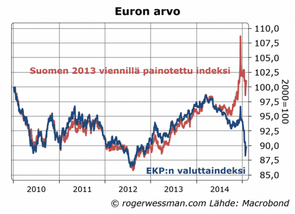 Suomen näkökulmasta tilanne on toinen. Painotettuna eri maiden osuudella Suomen viennistä euro on itse asiassa vahvistunut viimeisen vuoden aikana. Syynä on tietysti ennen kaikkea ruplan romahtaminen, mutta myös naapurimaidemme kruunujen arvon kehitys.