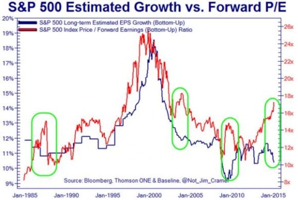 Tämän hetken arvostustason ja tulosodotusten erkaantuminen on ennätyksellisen korkea. Keskimääräinen S&P 500 -indeksin P/E-kerroin on yli 16 vaikka tuloskasvun ennusteet ovat laskeneet lähelle 10 prosenttia.