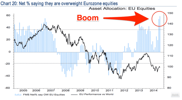 Jättipankin kyselyn mukaan sijoittajat ylipainottavat euroalueen osakkeita nyt enemmän kuin koskaan aiemmin.