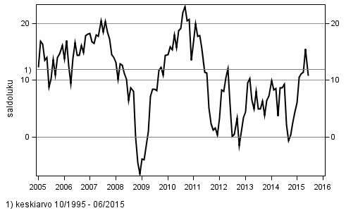 Indikaattorin pitkän ajan keskiarvo on 11,8. Tiedot perustuvat Tilastokeskuksen kuluttajabarometriin, jota varten haastateltiin 1. – 17. kesäkuuta 1 358 Suomessa asuvaa henkilöä.