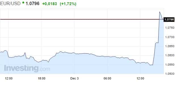 Markkinoilla osto-ohjelman pysyminen nykyisessä 60 miljardissa eurossa aiheutti rajun reaktion. Euron vaihtokurssi suhteessa dollariin ampaisi rajuun lähes 1,8 prosentin nousuun (klo 16.15 Suomen aikaa). Osakemarkkinoilla esimerkiksi Euro Stoxx 50 -osakeindeksi rojahti yli 2 prosentin laskuun.