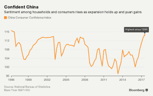 Kiinalaiskuluttajien luottamus (ks. kuva alla) nousi heinäkuussa (lukema 114,6) korkeimmalle tasolle kahteen vuosikymmeneen. Kuluttajien luottamusta talouteen tuki erityisesti Kiinan vahvistunut työllisyystilanne ja vahva palkkakehitys. Vahva kuluttajaluottamuksen kasvu on positiivinen ajuri erityisesti kulutustavarasektorin globaaleille yhtiöille, joille Kiina on tärkeä markkina. Lisäksi tilasto tukee Kiinan hallinnon tavoitetta viedä maata investointivetoisesta yhteiskunnasta kohti yksityisen kulutuksen taloutta.