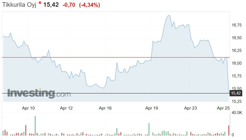 Tikkurilan osake oli tulosjulkistuksen jälkeen noin klo 10.45 laskussa lähes neljä prosenttia.