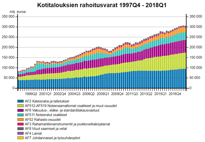 Tilastokeskuksen mukaan kotitalouksien rahoitusvaroista suurin osa makaa käteisrahassa ja talletuksissa sekä asunto-osakkeissa. Varsinaisia sijoituksia kotitaloudet tekevät pääasiassa rahastoihin ja listattuihin pörssiosakkeisiin. Esimerkiksi rahamarkkinainstrumenteissa ja joukkovelkakirjoissa on vain häviävän pieni osa varoista. Myöskään listaamattomien yhtiöiden osakkeissa ei juurikaan ole kotitalouksien varoja.