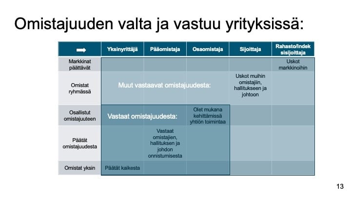 Omistajuutta voisi määritellä suhteessa omistamiseen aina ammatinharjoittajasta rahastosijoittajaan. Omistavan suhde yhtiöön määrittelee suoran tai epäsuoran vastuun yrityksen menestyksestä.