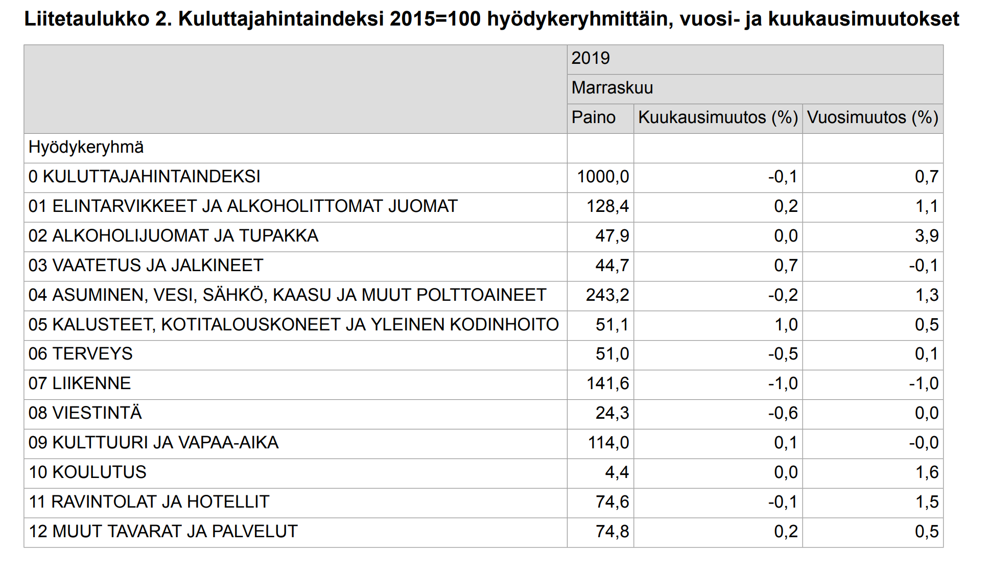 Suomen tilastokeskus mittaa inflaatiota ns. kuluttajahintakorin avulla. Korin koostumus ja painoarvot alla: