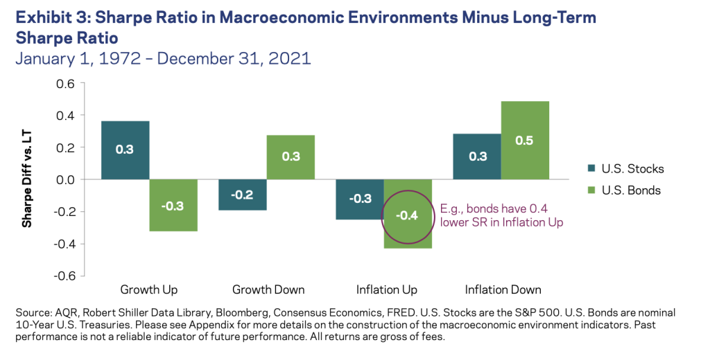 AQR Capital Management tutki S&P 500 -indeksin ja Yhdysvaltain 10 vuoden valtionlainan riskikorjattua tuottoa (Sharpen lukua) aikavälillä 1972-2021. Valtionlainan riskikorjattu tuotto oli korkein aikakausina, jolloin inflaatio tasoittui ja talouskasvu hidastui.
