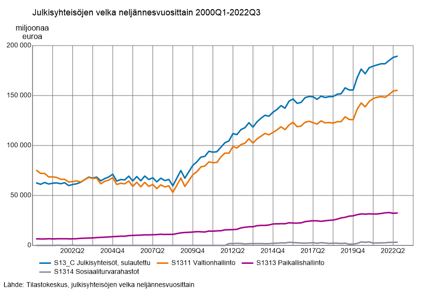 Tilastokeskuksen mukaan Suomen julkinen bruttovelka oli vuoden 2022 kolmannen neljänneksen lopussa 189 miljardia euroa ja kasvoi neljänneksen aikana 1,1 miljardia euroa. Suhteessa bruttokansantuotteeseen julkisyhteisöjen velka oli 71 prosenttia. Vuoden takaiseen ajankohtaan verrattuna julkisyhteisöjen velka on kasvanut 7,5 miljardia euroa.