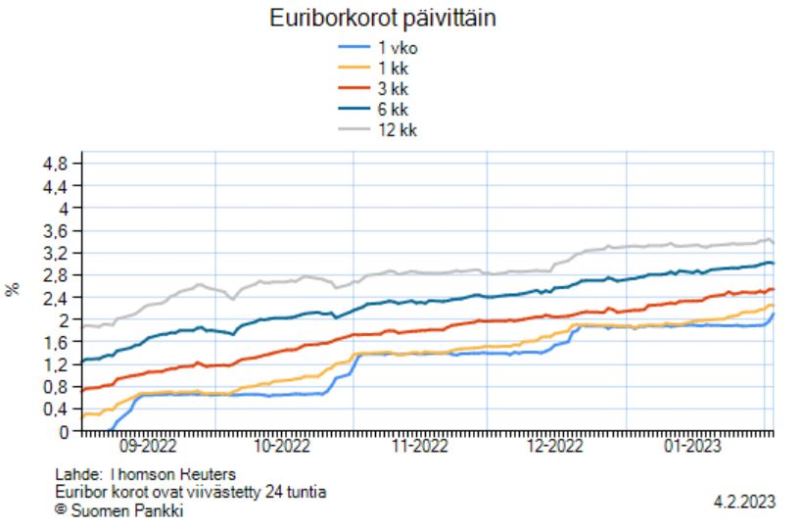 100 000 euron asuntolainassa, olettaen marginaali 0,7 prosenttiyksikön suuruiseksi, koronnousu tietää vuotuisten korkomenojen kasvua 700 eurosta 4 100 euroon. 12 kuukauden euriboriin sidotussa lainassa korkoa tarkistetaan 12 kuukauden välein.
