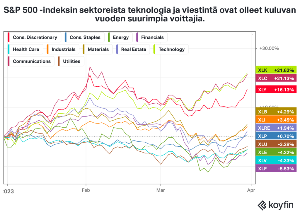 S&P 500 -indeksin parhaiten tuottaneet sektorit tänä vuonna ovat olleet viestintä ja teknologia. Viestintäalan osakkeet ovat kallistuneet 21,1 prosenttia ja teknologiasektorin 21,6 prosenttia. Markkina-arvoltaan suurimmat yhtiöt, megacapit, ovat tuottaneet merkittävästi enemmän kuin S&P 500 -indeksi.