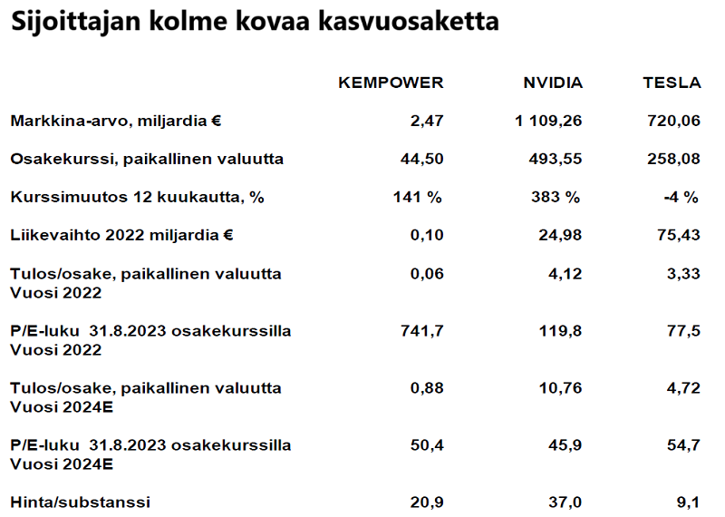 Angervuo laskee ennusteista, että Kempowerin P/E-luvuksi vuodelle 2024 tulee elokuun kurssitasolla 50,4, Nividian 45,9 ja Teslan 54,7.