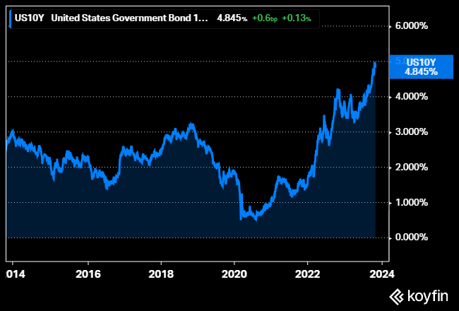 Lokakuussa Yhdysvaltain valtionlainojen korot nousivat jyrkästi. Kymmenen vuoden velkakirjan korko kävi hetkellisesti jo 5,0 prosentissa, mikä korkein lukema sitten vuoden 2007. Kahden vuoden vuoden velkakirjan korko on käynyt 5,25 prosentissa, korkeimmillaan sitten vuoden 2000.