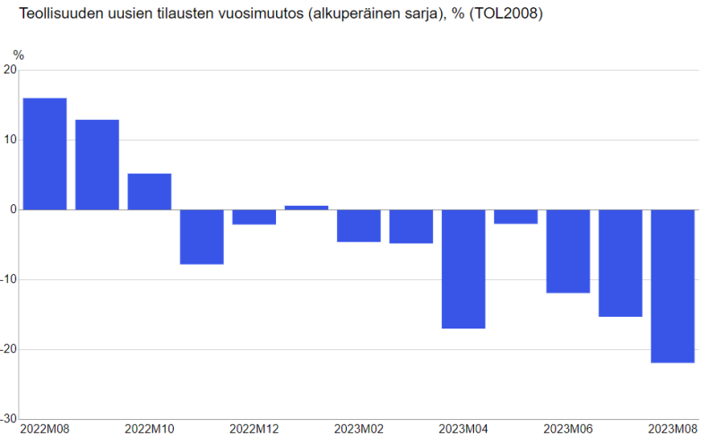 Teollisuuden uusien tilausten arvo oli Tilastokeskuksen mukaan vuoden 2023 elokuussa 21,9 prosenttia pienempi kuin vuotta aiemmin. Tammi-elokuun aikana tilaukset vähenivät 9,7 prosenttia vuodentakaisesta. Tilaukset ovat vähentyneet yhtäjaksoisesti seitsemän kuukautta.