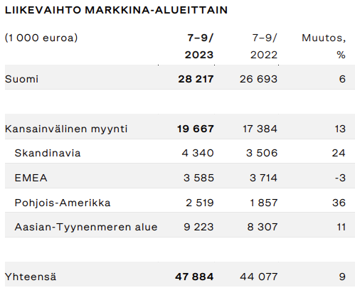 Brändiyhtiön liikevaihto heinä-syyskuussa kasvoi 9,0 prosenttia ja oli 47,9 miljoonaa euroa. Liikevaihtoa nosti erityisesti tukkumyynnin kasvu sekä kansainvälisesti että Suomessa. Yhteensä liikevaihto Suomessa kasvoi 6,0 prosenttia ja kansainvälinen liikevaihto 13 prosenttia.