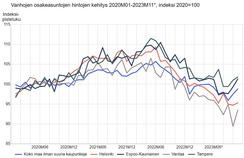 Tilastokeskuksen ennakkotietojen mukaan vanhojen osakeasuntojen hinnat laskivat marraskuussa koko maassa 3,9 prosenttia edellisestä vuodesta, mutta nousivat 1,4 prosenttia edellisestä kuukaudesta.