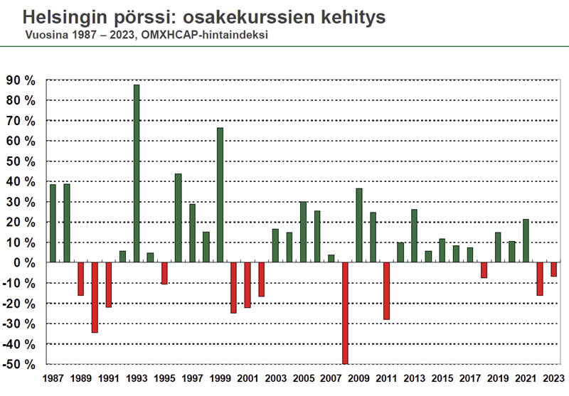 Economistin ja Angervuon laskelmat menevät yksi yhteen. Helsingin pörssin portfolioindeksi eli OMXCH on painunut Angervuon laskelmien mukaan kaksi prosenttia miinukselle melkein kolmen viimeisen vuoden jaksolla, joka yltää vuoden 2021 alusta kuluvan vuoden marraskuun loppuun.