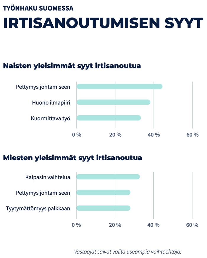 Pettymys johtamiseen on mukana sekä miesten että naisten yleisimmissä syissä, mutta muuten listat poikkeavat toisistaan.
