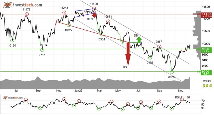 Osakeindeksi on rikkoutunut ylös vastustason läpi noin 9800 pisteen kohdalla. Näin ollen on signalisoitu edelleen tapahtuvaa nousua ja jos reaktioita takaisinpäin tapahtuu, on tukitaso nyt 9800 pisteen kohdalla.