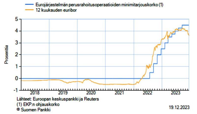 Asuntolainojen yleisin viitekorko 12 kuukauden euribor on noussut vuodessa 3,0 prosentin tasolta 3,6 prosenttiin. Korkeimmat 4,1-4,2 prosentin kuukausitason havainnot nähtiin kesäkuusta syyskuuhun 2023.