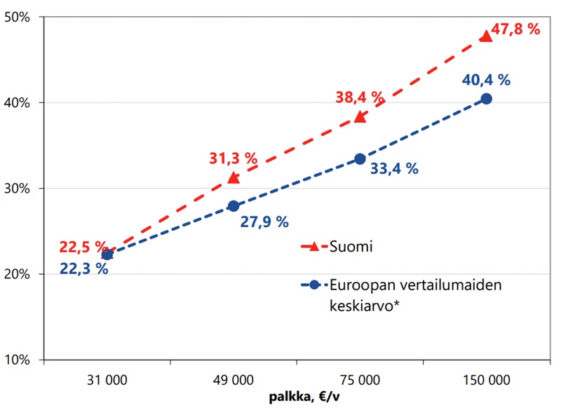 Palkan verotus on Suomessa vertailumaihin nähden sitä kireämpää, mitä suuremmat ovat tulot. Keskipalkkaa eli 49 000 euroa vuodessa ansaitsevan veroprosentti on Suomessa reilut kolme prosenttiyksikköä korkeampi kuin eurooppalaisissa vertailumaissa keskimäärin. Suomi on tällä palkkatasolla kaikkien vertailumaiden kuudenneksi kirein verottaja.