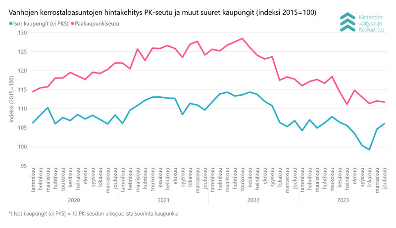 Vuoden takaiseen joulukuuhun verrattuna käytettyjen kerrostaloasuntojen keskimääräiset hinnat ovat laskeneet pääkaupunkiseudulla -4,3 prosenttia ja muissa isoissa kaupungeissa nousseet 1,8 prosenttia. Turussa laskua on tullut -7,9 prosenttia ja Tampereella -1,4 prosenttia, mutta Oulussa hinnat ovat nousseet 6,0 prosenttia.