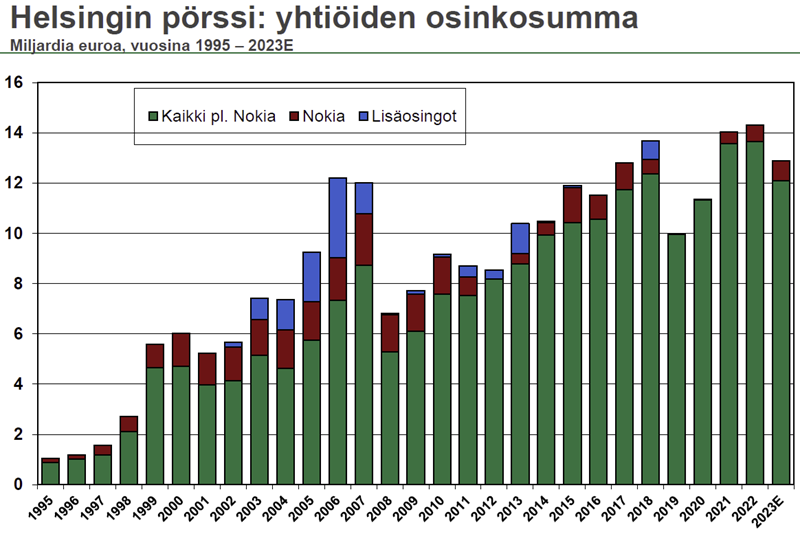 Omaisuudenhoidon pörssikonkarin Hannu Angervuon ennusteen mukaan Helsingin pörssin päälistan yhtiöiden osingot laskevat merkittävästi eli noin 1,5 miljardia euroa viime vuodelta verrattuna vuoden 2022 ennätystasoon”.