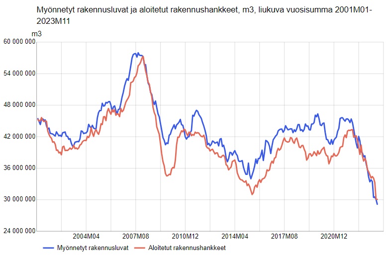 Tilastokeskuksen mukaan uudisrakentamiseen myönnettiin rakennuslupia syys-marraskuun 2023 aikana yhteensä 6,6 miljoonaa kuutiometriä, joka oli 17 prosenttia vähemmän kuin vuotta aiemmin. Samaan aikaan rakennushankkeita valmistui 9,6 miljoonaa kuutiometriä, 15 prosenttia vähemmän kuin vuotta aiemmin.