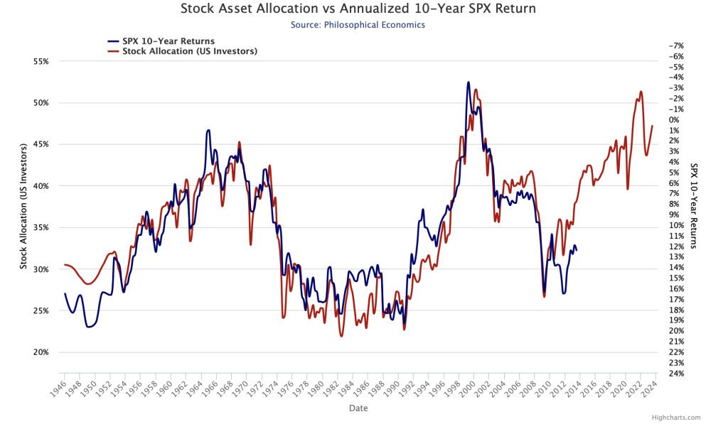 Yksi erinomaisesti pitkän aikavälin osaketuottoja ennustanut sijoittajasentimenttiin liittyvä mittari on amerikkalaisten sijoittajien osakeallokaatio. Se kuvaa keskimääräisen sijoittajan osakesijoitusten markkina-arvoa suhteessa koko sijoitussalkkuun.