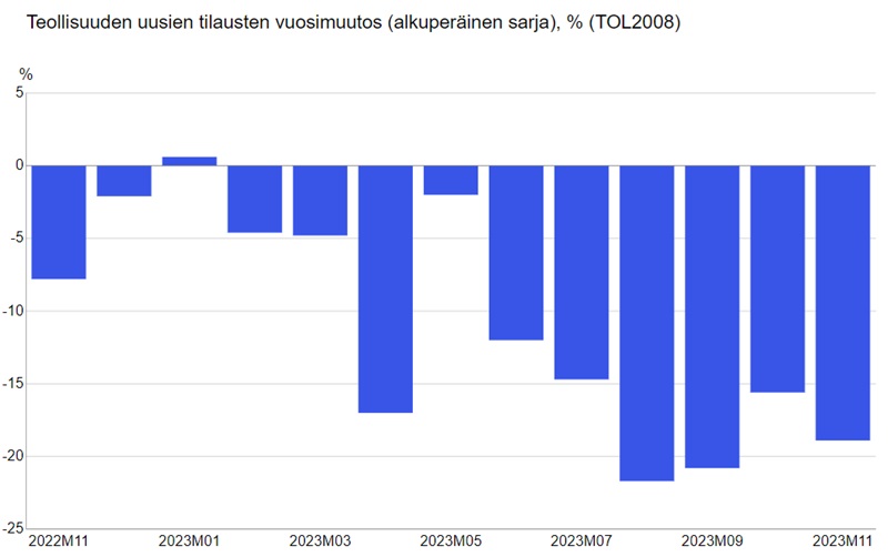 Teollisuuden uusien tilausten arvo oli Tilastokeskuksen mukaan vuoden 2023 marraskuussa 18,9 prosenttia pienempi kuin vuotta aiemmin. Tammi-marraskuun aikana tilaukset ovat vähentyneet 12,1 prosenttia vuodentakaisesta. Tilaukset ovat vähentyneet yhtäjaksoisesti kymmenen kuukautta.