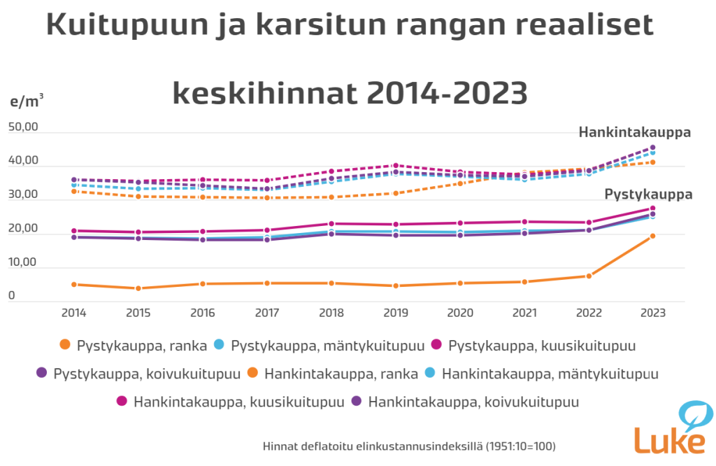 Energiapuun hinnat nousivat vuonna 2023 voimakkaasti, pystykaupoissa enemmän kuin hankintakaupoissa. Karsitun rangan keskihinta kohosi pystykaupoissa edellisestä vuodesta peräti 2,6-kertaiseksi 19,4 euroon kuutiometriltä. Hankintakaupoissa hinta kohosi 1,3-kertaiseksi 43,4 euroon.