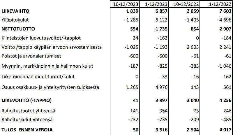Viimeisen neljänneksen tulosta painaa edellä mainittu konsernin omistamien kiinteistöjen arvonlasku 1,0 miljoonaa euroa sekä tytäryhtiö Juhola Asset Managementin liikearvon alaskirjaus 0,6 miljoonaa euroa. Tulosta puolestaan tuki osakkuusyhtiöiden, jotka olivat investointien kohteena, omistamien kiinteistöjen positiivinen arvonmuutos 1,5 miljoonaa euroa.