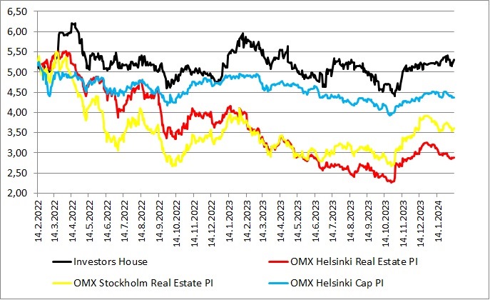 Osinkotuotto kevään osinkoehdotuksella (0,33 e) euroa tekee nykykurssia (5,14 e) vasten 6,4 prosenttia ollen erittäin hyvätasoinen. Tulos osakkeelta 2023 oli 0,56 euroa, joten osinko vastaa 59 prosenttia tuloksesta. Osakekohtainen nettovarallisuus (EPRA NRV) oli vuodenvaihteessa 5,76 euroa ja osakekohtainen oma (IFRS) pääoma 5,27 euroa (IFRS).