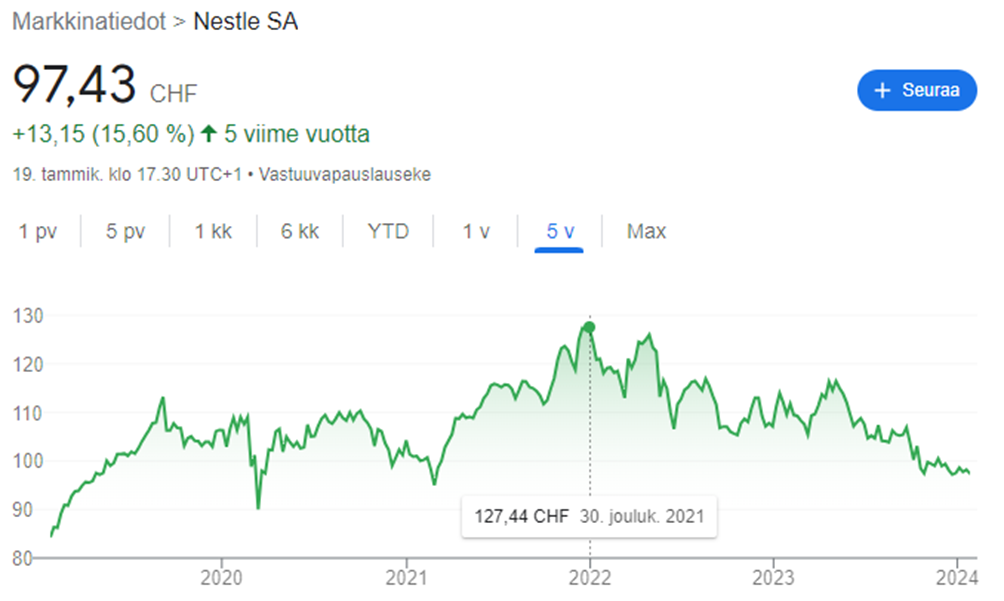 Nestlen osakkeelle viimeiset pari vuotta ovat olleet vaikeita. Vuoden 2022 alussa Nestlen osake maksoi 127 Sveitsin frangia, mutta nyt osake liikkuu 97 frangin tuntumassa. Kahvin hintaliikkeiden lisäksi osakekurssissa näkyy Ukrainan sodan alkaminen. Nestlé on saanut osakseen paljon negatiivista julkisuutta siitä, ettei se ole vetäytynyt Venäjältä.