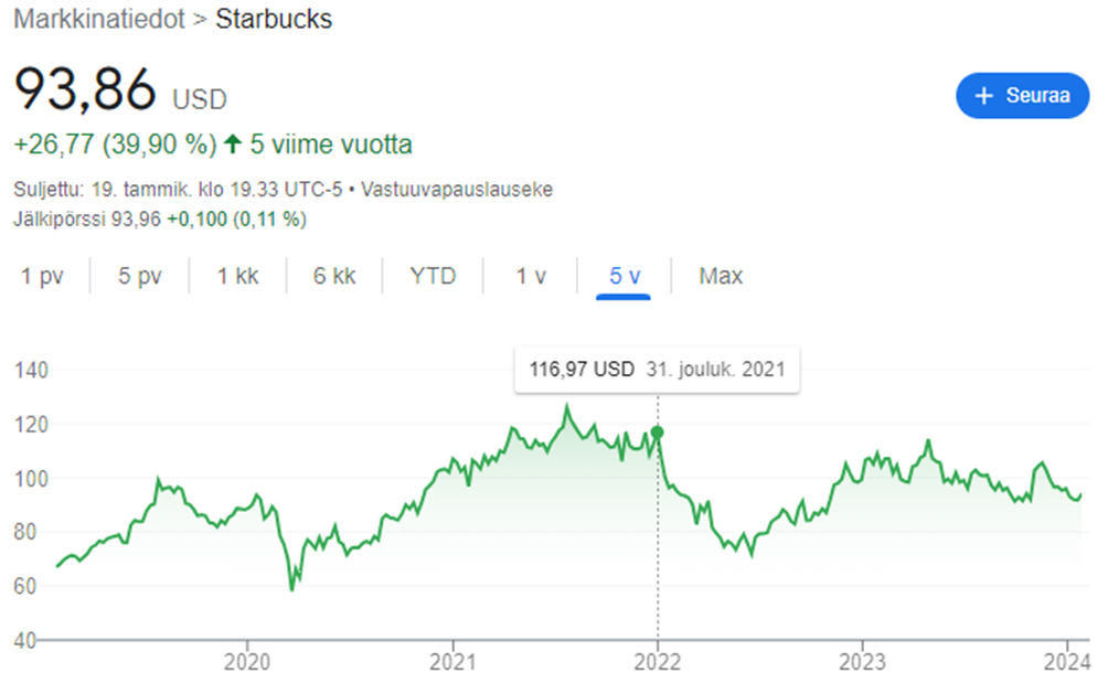 Myös Starbucksin osake on laskenut viimeisen parin vuoden aikana. Vuoteen 2022 lähdettäessä osake maksoi 117 dollaria, mutta tällä hetkellä osakkeen hinta liikkuu 94 dollarissa. Viimeisin suuri käänne nähtiin marraskuussa, jolloin Starbucks menetti kärkipaikan Kiinan markkinalla. Yhtiö on satsannut viime vuosina erityisesti Kiinan valloittamiseen.