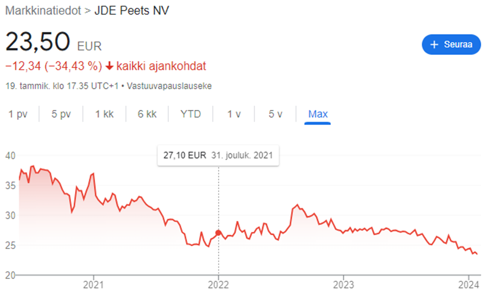 JDE Peet’sin vajaan neljän vuoden mittainen pörssihistoria on ollut kivikkoinen, sillä osakkeen trendi on ollut listautumisen jälkeen pääasiassa laskeva. Vuoden 2022 alussa osake maksoi 27 euroa ja tällä hetkellä 23,5 euroa. Samaan aikaan osakkeen hinta on sen pörssihistorian alimmalla tasolla.