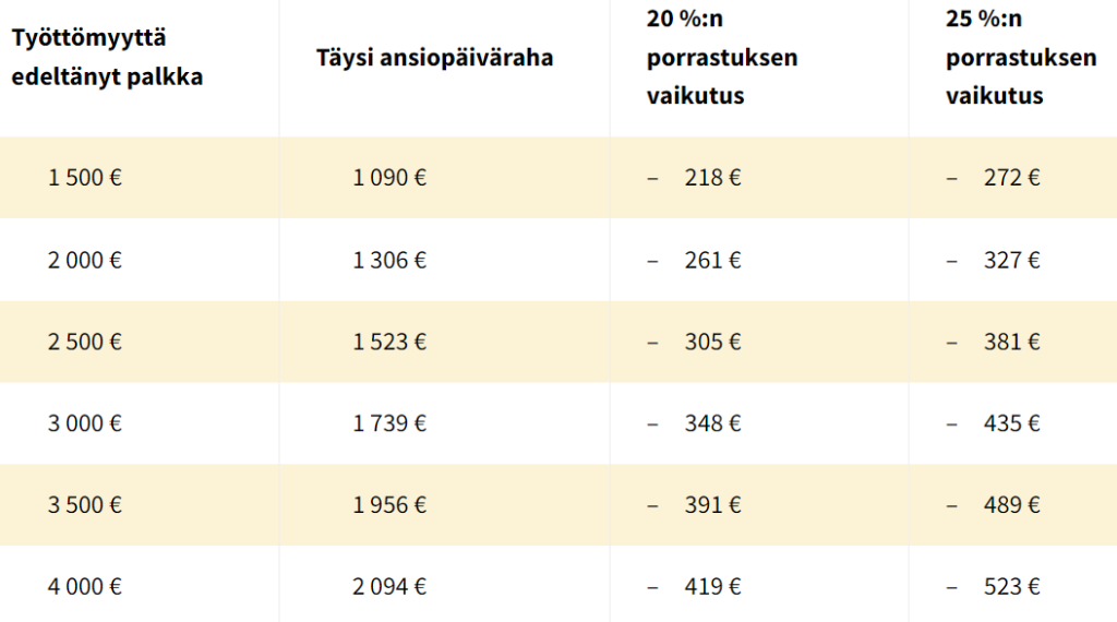 Työttömyyskassojen yhteistyöjärjestön laskelmien mukaan 20 prosentin porrastus tarkoittaisi henkilöillä, joiden työttömyyttä edeltänyt palkka on ollut 2500 euroa, noin 305 euron ansiopäivärahan menetystä kuukaudessa. 25 prosentin porrastus leikkaa ansiosidonnaista tässä esimerkissä jo 381 euroa kuukaudessa.