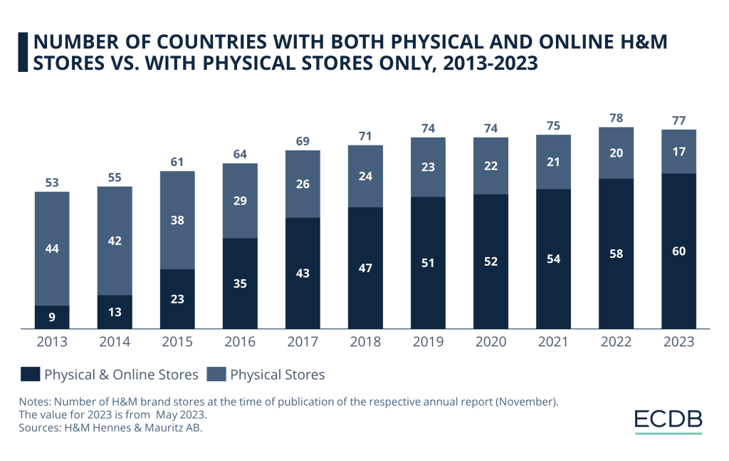 Yhtiö on kuitenkin onnistunut kasvattamaan verkkokauppaansa. Yhtiön julkaisemien tietojen mukaan suuntaus kohti kasvavaa verkkomyymälöiden läsnäoloa jatkuu. 77 prosentissa maista on sekä fyysisiä että verkossa toimivia H&M-myymälöitä vuonna 2023.