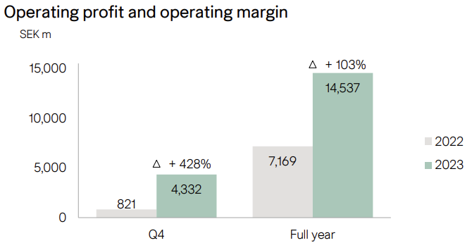 Koko vuoden 2023 liikevoitto kasvoi 14,5 miljardiin kruunuun, kun edellisvuonna liikevoitto oli 7,2 miljardia kruunua. Vuonna 2022 koko vuoden tulosta rasittivat Venäjän toimintojen lopettamisesta sekä kustannus- ja tehostamisohjelmasta aiheutuneet 2,6 miljardin kruunun kertaluonteiset kustannukset.